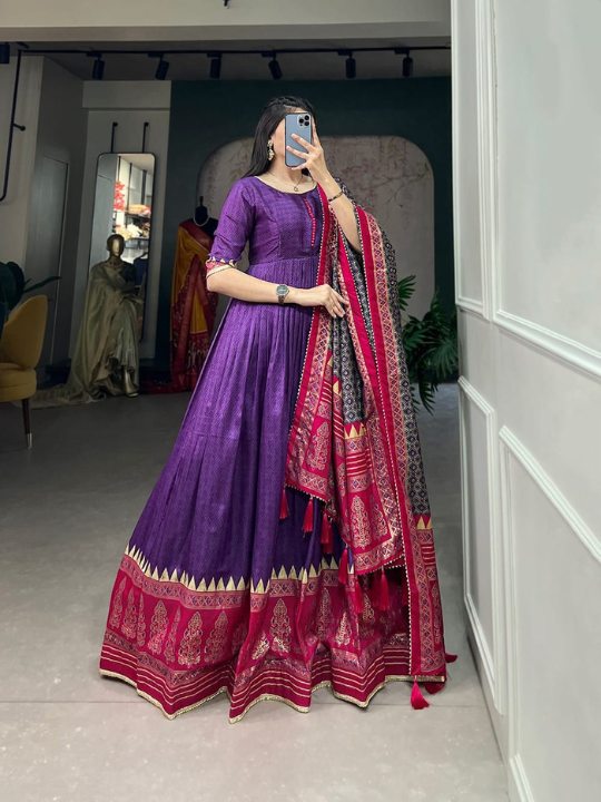 🌷 Step into elegance with our Ready-to-Wear Tusser Silk Designer Gown, a perfect blend of contemporary style and classic charm. Crafted in premium Tasar Silk with stunning foil prints, this gown offers a flattering fit with extra margin for comfort (chest 36–40”). Designed with a full micro cotton lining and a 3.8-meter flair, it ensures both style and ease. Paired with a beautifully detailed Tasar Silk dupatta featuring foil print, tassels, and gotta patti lace border. Package includes gown and dupatta. Available now at just ₹1199 + shipping.