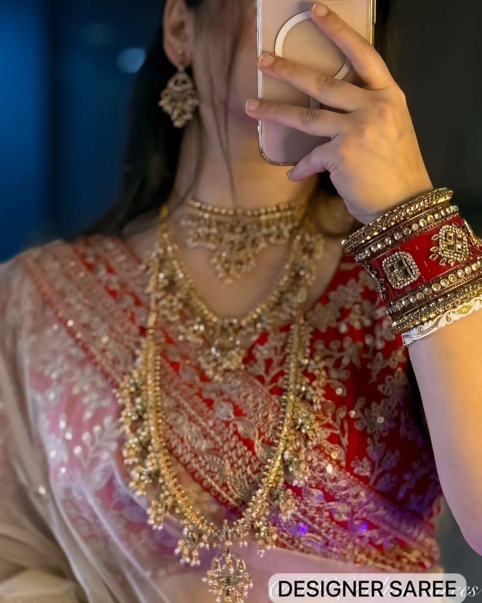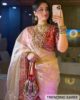 Unveil your inner fashionista with our stunning muted Champaign gold designer organza saree paired with the most sought-after Embroidery blouse in rich red