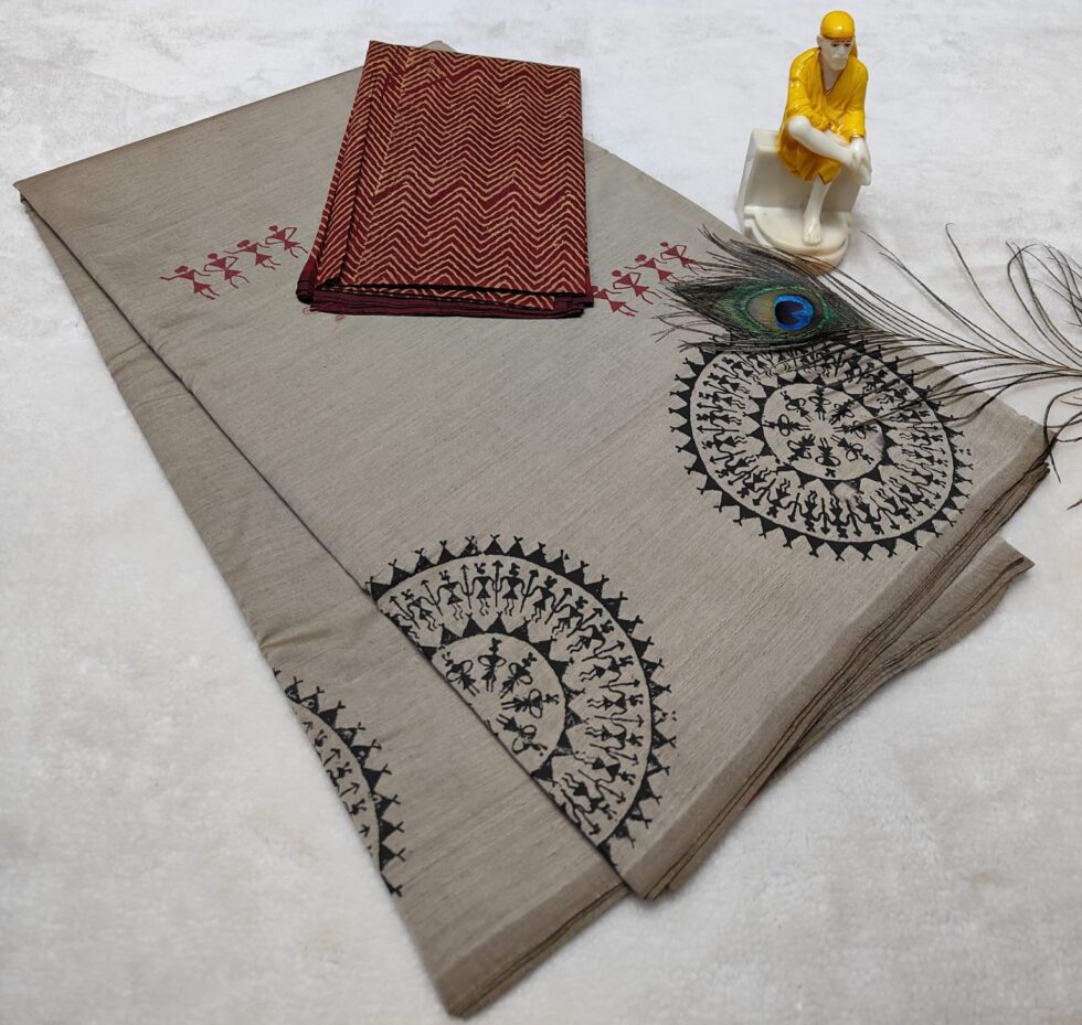 South cotton-mix block printed saree with self and contrast blouse