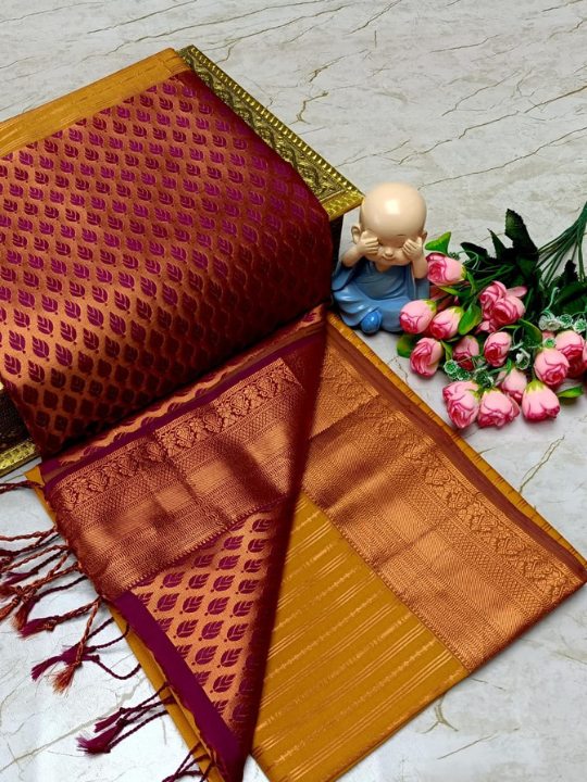 ✨ Elevate your style with our Vairaoosi Silk Sarees, crafted from high-quality Catonic Karishma Silk yarn for a luxurious feel. Adorned with intricate Vairaoosi jari designs all over, these sarees feature a grand jari border and a contrasting jari pallu (mundhi), paired with a matching contrast blouse. Comfortable to wear and premium in quality, this saree is the perfect choice for festive and special occasions.
